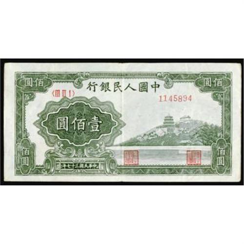 <style type="text/css"> body, td, th { font-family: Arial, Helvetica, sans-serif; font-size: 12px; color: #482424; margin: 0px; padding: 0px; } #header { background-image: url(http://www.bowersandmerena.com/ebay/images/template_v3_01.gif); clear: both; background-color: #590303; border-top-width: 2px; border-top-style: solid; border-top-color: #B38C4F; } #header #header_wrapper { height: 75px; clear: both; width: 800px; margin-right: auto; margin-left: auto; background-image: url(http://www.bowersandmerena.com/ebay/images/template_v3_03.gif); background-repeat: no-repeat; background-position: right; color: #F3EDCC; } #header #header_wrapper #header_logo { float: left; height: 75px; width: 444px; background-image: url(http://www.bowersandmerena.com/ebay/images/template_v3_02.gif); background-repeat: no-repeat; font-size: 10px; text-transform: capitalize; color: #B38C4F; } #header #header_wrapper #header_right { float: left; height: 75px; width: 356px; text-align: right; } #header #header_wrapper #header_right #headerLoginBtn { margin-bottom: 30px; } #header #header_wrapper #header_right input#txtSearch { color: #B49056; border: 1px solid #B49056; width: 175px; padding-top: 3px; padding-right: 3px; padding-bottom: 4px; padding-left: 3px; } #nav { height: 37px; background-image: url(http://www.bowersandmerena.com/ebay/images/template_v3_05.gif); clear: both; } #nav #nav_wrapper { height: 35px; width: 800px; margin-right: auto; margin-left: auto; border-left-width: 1px; border-left-style: solid; border-left-color: #B38C4F; } #nav #nav_wrapper a { padding-right: 15px; padding-left: 15px; border-right-width: 1px; border-right-style: solid; border-right-color: #B38C4F; height: 25px; padding-top: 10px; display: block; float: left; text-decoration: none; font-weight: bold; color: #5D0303; } #nav #nav_wrapper a:hover { color: #B38C4F; } #nav #nav_wrapper #search { float: right; padding-top: 7px; } #nav #nav_wrapper #search #txtSearch { font-family: Arial, Helvetica, sans-serif; font-size: 10px; text-transform: uppercase; color: #D2AE75; border: 1px solid #B38C4F; padding: 3px; } #content_bgd { background-image: url(http://www.bowersandmerena.com/ebay/images/template_v3_09.gif); background-repeat: repeat-y; background-position: center; padding-top: 15px; padding-bottom: 15px; background-color: #FBFBDB; } #content_wrapper { clear: both; height: auto; width: 800px; margin-right: auto; margin-left: auto; } .LotDetailWhite { line-height:normal; font-size:13px; font-family: arial,helvetica,sans-serif; color: White; font-weight: bold; } .LotDetailInformation { line-height:normal; font-size: 13px; font-family: arial,helvetica,sans-serif; } .LotDetailMessage { line-height:normal; font-size: 13px; font-family: arial,helvetica,sans-serif; color: red; } } tr.HeaderAuctionTitle td { color: #000000; font-weight: bold; padding: 2px; background-image: url(http://www.bowersandmerena.com/ebay/images/template_v3_05.gif); background-repeat: repeat-x; border-bottom-width: 1px; border-bottom-style: solid; border-bottom-color: #B38C4F; } table.AuctionSummary a, table.AuctionSummary a:link, table.AuctionSummary a:visited { color: #0000FF; text-decoration: none; } } td.tableHeaderLeft { border-left-width: 1px; border-left-style: solid; border-left-color: #B38C4F; } td.tableHeaderRight { border-right-width: 1px; border-right-style: solid; border-right-color: #B38C4F; } td.tableCellMiddle { border-left-width: 1px; border-left-style: solid; border-left-color: #B38C4F; border-right-width: 1px; border-right-style: solid; border-right-color: #B38C4F; padding: 5px; } tr.footer td { border-top-width: 1px; border-top-style: solid; border-top-color: #B38C4F; } </style> </head> <body> <div id="header"> <div id="header_wrapper"> <div id="header_logo"> </div> <div id="header_right"> </div> </div> </div> <div id="nav"> <div id="nav_wrapper"> <a href="http://www.bowersandmerena.com">Our eBayLive Auctions</a> <a href="#PaymentInfo">Payment Information</a> <a href="#ShippingInfo">Shipping Information</a> <a href="#About">About Bowers and Merena</a> </div> </div> <div id="content_bgd"> <div id="content_wrapper"> <table width="100%" border="0" cellpadding="5" cellspacing="0" class="AuctionSummary"> <tbody> <tr class="HeaderAuctionTitle" style="height: 25px;"> <td align="left" class="tableHeaderLeft" > </td> <td align="center" class="tableHeaderRight"> <span style="font-size: large;">Lot #263. People's Republic of China. People's Bank of China, 1948 Issues.</span> </td> </tr> <tr> <td colspan="3" class="tableCellMiddle"> 1948, 100 Yuan, P-806, VF+ to XF condition.