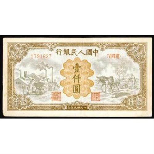 <style type="text/css"> body, td, th { font-family: Arial, Helvetica, sans-serif; font-size: 12px; color: #482424; margin: 0px; padding: 0px; } #header { background-image: url(http://www.bowersandmerena.com/ebay/images/template_v3_01.gif); clear: both; background-color: #590303; border-top-width: 2px; border-top-style: solid; border-top-color: #B38C4F; } #header #header_wrapper { height: 75px; clear: both; width: 800px; margin-right: auto; margin-left: auto; background-image: url(http://www.bowersandmerena.com/ebay/images/template_v3_03.gif); background-repeat: no-repeat; background-position: right; color: #F3EDCC; } #header #header_wrapper #header_logo { float: left; height: 75px; width: 444px; background-image: url(http://www.bowersandmerena.com/ebay/images/template_v3_02.gif); background-repeat: no-repeat; font-size: 10px; text-transform: capitalize; color: #B38C4F; } #header #header_wrapper #header_right { float: left; height: 75px; width: 356px; text-align: right; } #header #header_wrapper #header_right #headerLoginBtn { margin-bottom: 30px; } #header #header_wrapper #header_right input#txtSearch { color: #B49056; border: 1px solid #B49056; width: 175px; padding-top: 3px; padding-right: 3px; padding-bottom: 4px; padding-left: 3px; } #nav { height: 37px; background-image: url(http://www.bowersandmerena.com/ebay/images/template_v3_05.gif); clear: both; } #nav #nav_wrapper { height: 35px; width: 800px; margin-right: auto; margin-left: auto; border-left-width: 1px; border-left-style: solid; border-left-color: #B38C4F; } #nav #nav_wrapper a { padding-right: 15px; padding-left: 15px; border-right-width: 1px; border-right-style: solid; border-right-color: #B38C4F; height: 25px; padding-top: 10px; display: block; float: left; text-decoration: none; font-weight: bold; color: #5D0303; } #nav #nav_wrapper a:hover { color: #B38C4F; } #nav #nav_wrapper #search { float: right; padding-top: 7px; } #nav #nav_wrapper #search #txtSearch { font-family: Arial, Helvetica, sans-serif; font-size: 10px; text-transform: uppercase; color: #D2AE75; border: 1px solid #B38C4F; padding: 3px; } #content_bgd { background-image: url(http://www.bowersandmerena.com/ebay/images/template_v3_09.gif); background-repeat: repeat-y; background-position: center; padding-top: 15px; padding-bottom: 15px; background-color: #FBFBDB; } #content_wrapper { clear: both; height: auto; width: 800px; margin-right: auto; margin-left: auto; } .LotDetailWhite { line-height:normal; font-size:13px; font-family: arial,helvetica,sans-serif; color: White; font-weight: bold; } .LotDetailInformation { line-height:normal; font-size: 13px; font-family: arial,helvetica,sans-serif; } .LotDetailMessage { line-height:normal; font-size: 13px; font-family: arial,helvetica,sans-serif; color: red; } } tr.HeaderAuctionTitle td { color: #000000; font-weight: bold; padding: 2px; background-image: url(http://www.bowersandmerena.com/ebay/images/template_v3_05.gif); background-repeat: repeat-x; border-bottom-width: 1px; border-bottom-style: solid; border-bottom-color: #B38C4F; } table.AuctionSummary a, table.AuctionSummary a:link, table.AuctionSummary a:visited { color: #0000FF; text-decoration: none; } } td.tableHeaderLeft { border-left-width: 1px; border-left-style: solid; border-left-color: #B38C4F; } td.tableHeaderRight { border-right-width: 1px; border-right-style: solid; border-right-color: #B38C4F; } td.tableCellMiddle { border-left-width: 1px; border-left-style: solid; border-left-color: #B38C4F; border-right-width: 1px; border-right-style: solid; border-right-color: #B38C4F; padding: 5px; } tr.footer td { border-top-width: 1px; border-top-style: solid; border-top-color: #B38C4F; } </style> </head> <body> <div id="header"> <div id="header_wrapper"> <div id="header_logo"> </div> <div id="header_right"> </div> </div> </div> <div id="nav"> <div id="nav_wrapper"> <a href="http://www.bowersandmerena.com">Our eBayLive Auctions</a> <a href="#PaymentInfo">Payment Information</a> <a href="#ShippingInfo">Shipping Information</a> <a href="#About">About Bowers and Merena</a> </div> </div> <div id="content_bgd"> <div id="content_wrapper"> <table width="100%" border="0" cellpadding="5" cellspacing="0" class="AuctionSummary"> <tbody> <tr class="HeaderAuctionTitle" style="height: 25px;"> <td align="left" class="tableHeaderLeft" > </td> <td align="center" class="tableHeaderRight"> <span style="font-size: large;">Lot #307. People's Republic of China. People's Bank of China, 1949 Issues.</span> </td> </tr> <tr> <td colspan="3" class="tableCellMiddle"> 1949, 1000 Yuan, P-850, VF condition.