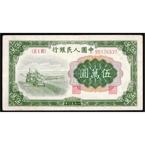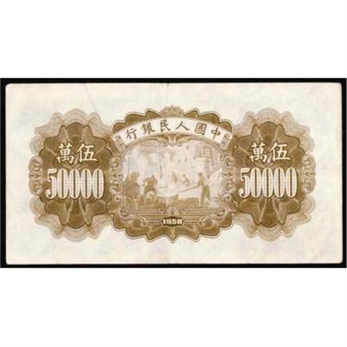 <style type="text/css"> body, td, th { font-family: Arial, Helvetica, sans-serif; font-size: 12px; color: #482424; margin: 0px; padding: 0px; } #header { background-image: url(http://www.bowersandmerena.com/ebay/images/template_v3_01.gif); clear: both; background-color: #590303; border-top-width: 2px; border-top-style: solid; border-top-color: #B38C4F; } #header #header_wrapper { height: 75px; clear: both; width: 800px; margin-right: auto; margin-left: auto; background-image: url(http://www.bowersandmerena.com/ebay/images/template_v3_03.gif); background-repeat: no-repeat; background-position: right; color: #F3EDCC; } #header #header_wrapper #header_logo { float: left; height: 75px; width: 444px; background-image: url(http://www.bowersandmerena.com/ebay/images/template_v3_02.gif); background-repeat: no-repeat; font-size: 10px; text-transform: capitalize; color: #B38C4F; } #header #header_wrapper #header_right { float: left; height: 75px; width: 356px; text-align: right; } #header #header_wrapper #header_right #headerLoginBtn { margin-bottom: 30px; } #header #header_wrapper #header_right input#txtSearch { color: #B49056; border: 1px solid #B49056; width: 175px; padding-top: 3px; padding-right: 3px; padding-bottom: 4px; padding-left: 3px; } #nav { height: 37px; background-image: url(http://www.bowersandmerena.com/ebay/images/template_v3_05.gif); clear: both; } #nav #nav_wrapper { height: 35px; width: 800px; margin-right: auto; margin-left: auto; border-left-width: 1px; border-left-style: solid; border-left-color: #B38C4F; } #nav #nav_wrapper a { padding-right: 15px; padding-left: 15px; border-right-width: 1px; border-right-style: solid; border-right-color: #B38C4F; height: 25px; padding-top: 10px; display: block; float: left; text-decoration: none; font-weight: bold; color: #5D0303; } #nav #nav_wrapper a:hover { color: #B38C4F; } #nav #nav_wrapper #search { float: right; padding-top: 7px; } #nav #nav_wrapper #search #txtSearch { font-family: Arial, Helvetica, sans-serif; font-size: 10px; text-transform: uppercase; color: #D2AE75; border: 1px solid #B38C4F; padding: 3px; } #content_bgd { background-image: url(http://www.bowersandmerena.com/ebay/images/template_v3_09.gif); background-repeat: repeat-y; background-position: center; padding-top: 15px; padding-bottom: 15px; background-color: #FBFBDB; } #content_wrapper { clear: both; height: auto; width: 800px; margin-right: auto; margin-left: auto; } .LotDetailWhite { line-height:normal; font-size:13px; font-family: arial,helvetica,sans-serif; color: White; font-weight: bold; } .LotDetailInformation { line-height:normal; font-size: 13px; font-family: arial,helvetica,sans-serif; } .LotDetailMessage { line-height:normal; font-size: 13px; font-family: arial,helvetica,sans-serif; color: red; } } tr.HeaderAuctionTitle td { color: #000000; font-weight: bold; padding: 2px; background-image: url(http://www.bowersandmerena.com/ebay/images/template_v3_05.gif); background-repeat: repeat-x; border-bottom-width: 1px; border-bottom-style: solid; border-bottom-color: #B38C4F; } table.AuctionSummary a, table.AuctionSummary a:link, table.AuctionSummary a:visited { color: #0000FF; text-decoration: none; } } td.tableHeaderLeft { border-left-width: 1px; border-left-style: solid; border-left-color: #B38C4F; } td.tableHeaderRight { border-right-width: 1px; border-right-style: solid; border-right-color: #B38C4F; } td.tableCellMiddle { border-left-width: 1px; border-left-style: solid; border-left-color: #B38C4F; border-right-width: 1px; border-right-style: solid; border-right-color: #B38C4F; padding: 5px; } tr.footer td { border-top-width: 1px; border-top-style: solid; border-top-color: #B38C4F; } </style> </head> <body> <div id="header"> <div id="header_wrapper"> <div id="header_logo"> </div> <div id="header_right"> </div> </div> </div> <div id="nav"> <div id="nav_wrapper"> <a href="http://www.bowersandmerena.com">Our eBayLive Auctions</a> <a href="#PaymentInfo">Payment Information</a> <a href="#ShippingInfo">Shipping Information</a> <a href="#About">About Bowers and Merena</a> </div> </div> <div id="content_bgd"> <div id="content_wrapper"> <table width="100%" border="0" cellpadding="5" cellspacing="0" class="AuctionSummary"> <tbody> <tr class="HeaderAuctionTitle" style="height: 25px;"> <td align="left" class="tableHeaderLeft" > </td> <td align="center" class="tableHeaderRight"> <span style="font-size: large;">Lot #311. People's Republic of China. People's Bank of China, 1950 Issues.</span> </td> </tr> <tr> <td colspan="3" class="tableCellMiddle"> 1950, 50,000 Yuan, P-855, XF+ to AU condition, extremely scarce in any grade.