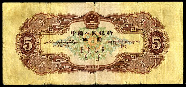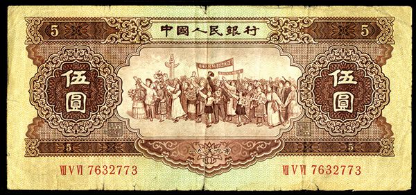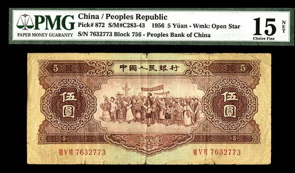 China, 5 Yuan, P-872 S/M#C283-43, Issued banknote, Watermarked Open Star, Block 756, S/N 7632773, PMG graded Choice Fine 15 NET with note of small edge tears.