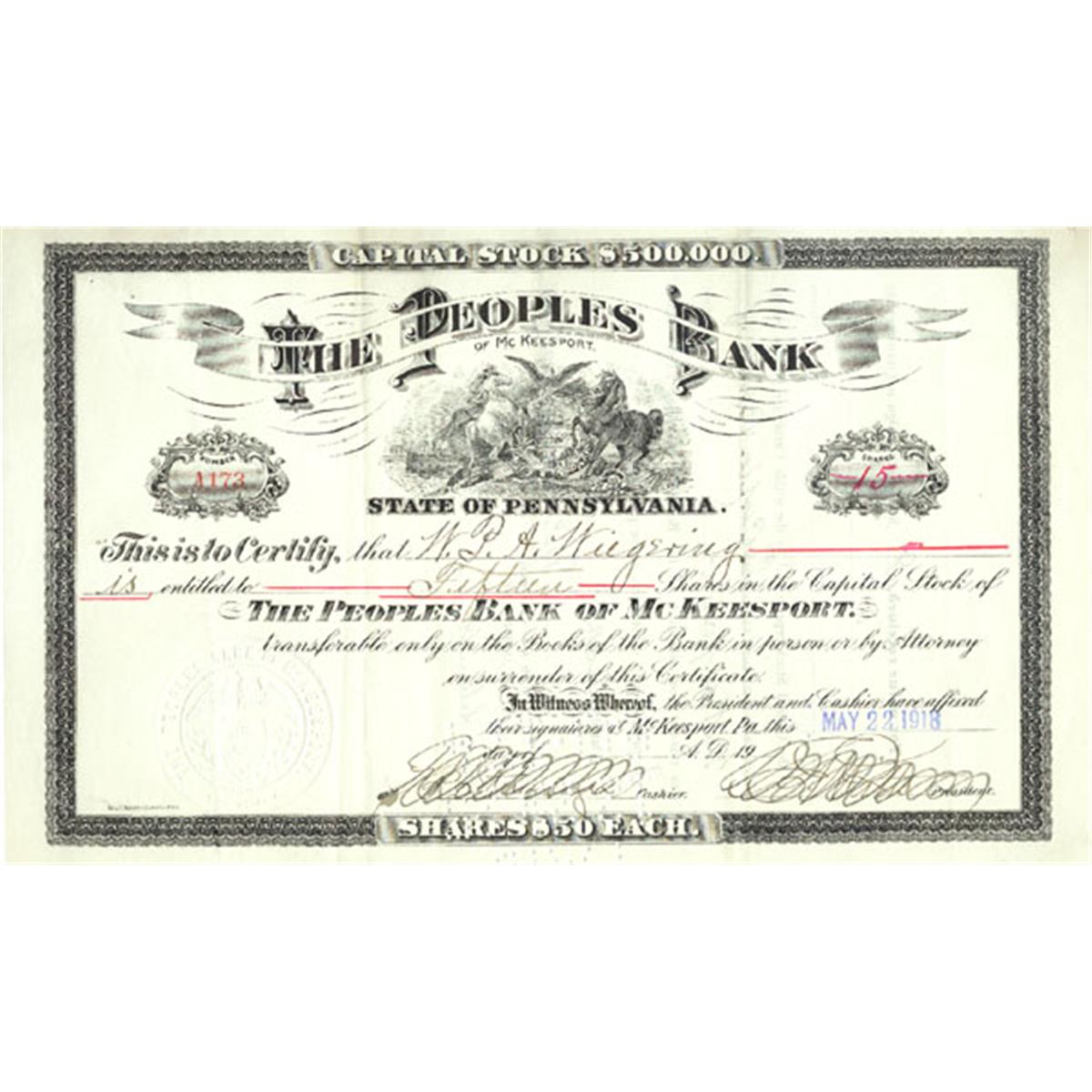 1918, Pennsylvania. Stock certificate for 15 shares. Black. Vignette of Pennsylvania State seal at top center. Litho. Lightly stamp and punch cancelled. Very Fine.
