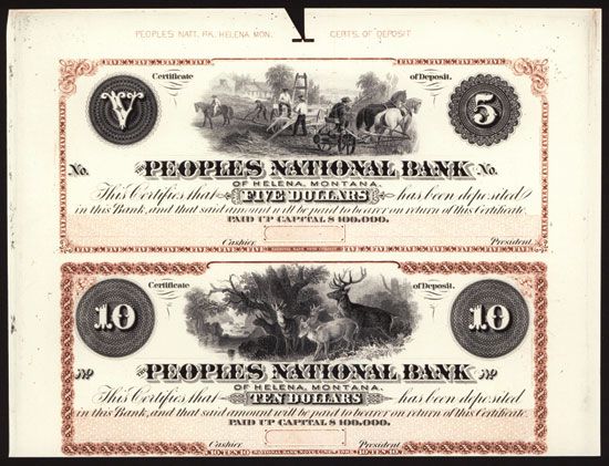 Helena, Montana Territory, ND (ca.1870-80's), $5-$10, Haxby Unlisted, Modern ÒProprietary ProofsÓ. $5 with men plowing in middle, the $10 with family of elk by stream, Black printing with dark burgundy red underprint printed on thin white card, CU to Gem Uncirculated condition. National BNC. Archival ÒProprietaryÓ proofs rarely seen in sheet form. (ABN Commemoratives, AIA XI, May 15, 2012)