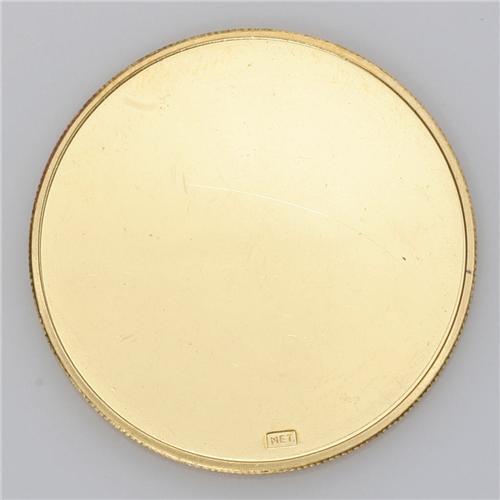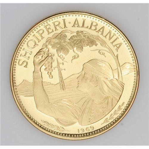 <B>Peoples Republic goldine 100 Leke 1969 UNIFACE, </B></I>type of KM54, obverse only striking with the peasant girl and date below. The reverse is blank except for a small indent with letters MET. Choice Proof and undoubtedly very rare. Please note that this trial striking is in goldine and not gold!