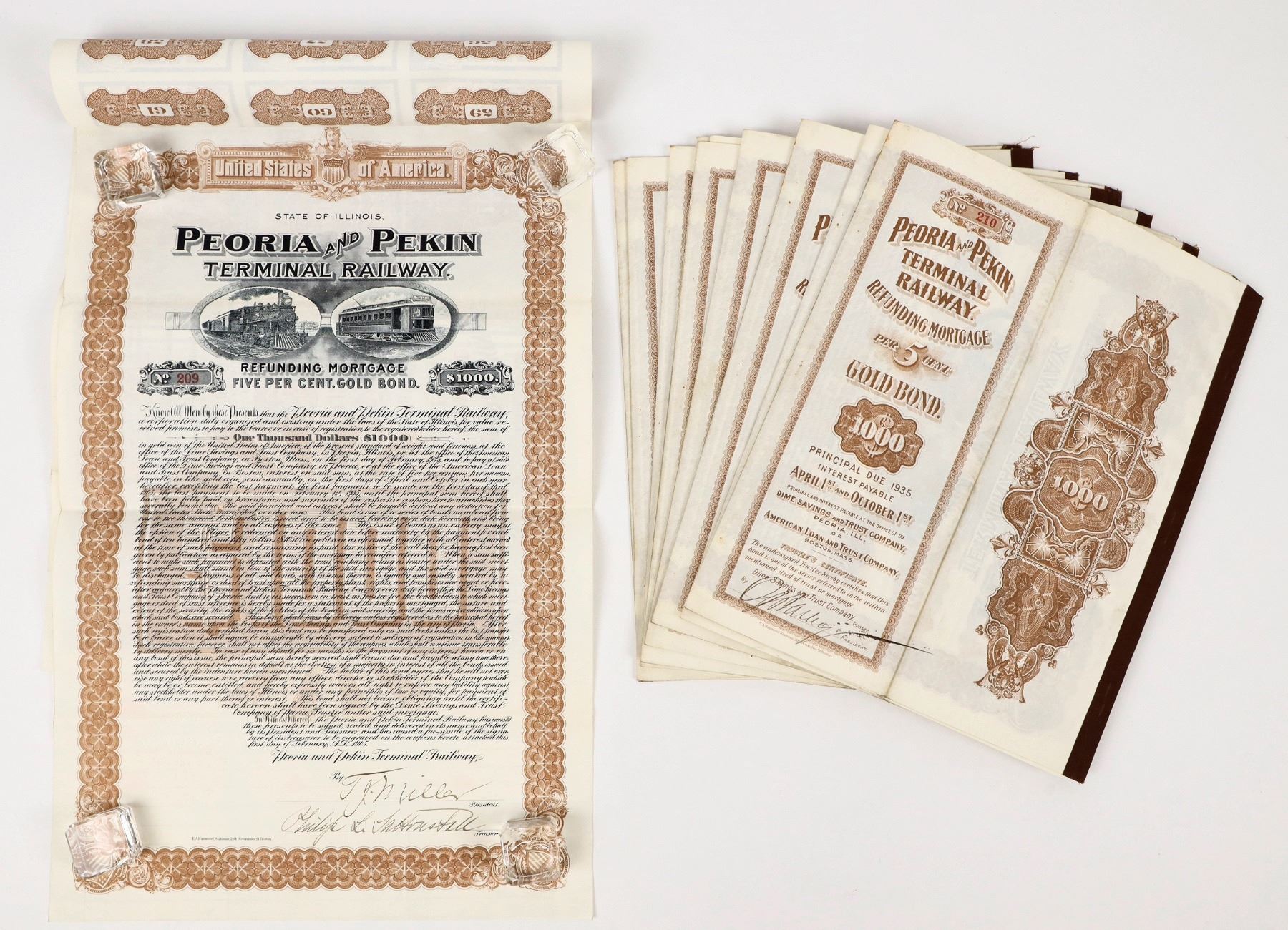 Lot of 11. I/U. Issued 1905. EF cond. Peoria And Pekin Terminal Railway, $1000, 5% refunding bond with coupons. E. A. Hammond printer.
