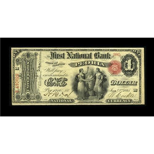 <B>Peoria, IL</B></I> - $1 Original Fr. 380 <B>The First NB</B></I> Ch. # 176<BR>While notes from this bank are hardly rare, we know of only two early examples of any kind from here, with one having been off the market for so long we have never seen it offered for sale. This piece, which we sold as part of the Lynn Shaw collection more than five years ago, is a most attractive specimen which displays virtually no evidence of any real circulation. <B>Extremely Fine-About Uncirculated,</B></I> a premium note certain to enhance any collection.