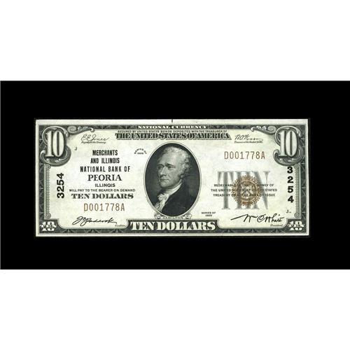 <B>Peoria, IL</B></I> - $10 1929 Ty. 1 <B>Merchants & Illinois NB</B></I> Ch. # 3254<BR>Embossing, bright paper, and original surfaces highlight this $10. <B>Choice About Uncirculated.</B></I>