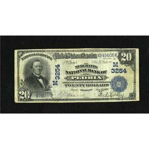 <B>Peoria, IL</B></I> - $20 1902 Date Back Fr. 642 <B>Merchants NB</B></I> Ch. # (M)3254<BR>The signatures remain, though one is a touch weak. <B>Fine,</B></I> ex-Shaw Collection.<BR><I>From The Lincoln Collection</B></I><BR><BR><b>Shipping:</b> Coins & Currency (<a target="_blank" href="http://www.heritageauctions.com/common/shipping.php">view shipping information</a>)
