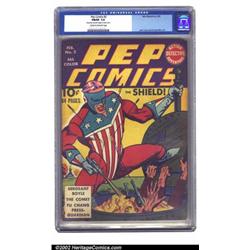 Pep #2 (MLJ, 1940) CGC FN/VF 7.0 Cream to off-white pages. This venerable title originated just after MLJ published its first comic book, Blue Ribbon #1. Irv Novick created this Shield cover, and Jack Cole and Charles Biro helped with interior art. Overstreet 2002 FN 6.0 value = $681; VF 8.0 value = $1,420. Important notice: We expect to be auctioning lots at the rate of 200-250 per hour. Sometimes eBay Premier live bid software cannot keep up with that pace, so we strongly recommend that you place a realistic proxy bid now as insurance to avoid disappointment. Also please note that all Heritage/CAA lots purchased through eBay Premier carry a 20% Buyer's Premium. Please make sure you read the Terms and Conditions.