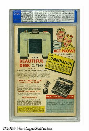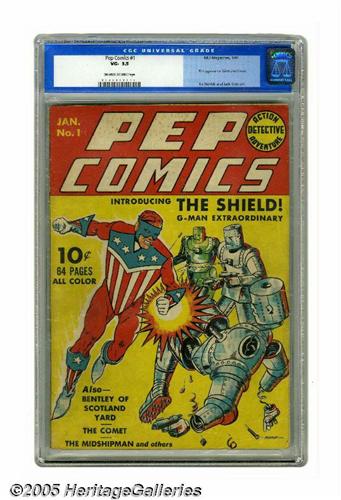 <B>Pep Comics #1 (MLJ, 1940) CGC VG- 3.5 Off-white to white pages.</B></I> The Shield's first appearance in this issue predated the debuts of Captain America and other star-spangled types, making the Shield the first patriotic-themed superhero. Among many other features in the issue are the origin and first appearance of the Comet (by Plastic Man's creator Jack Cole) and the one and only Press Guardian (called the Falcon in this first appearance only), who did his part to protect the freedoms of the Fourth Estate. Irv Novick drew the robot cover as well as the Shield story inside the comic. Overstreet 2005 VG 4.0 value = $1,936. CGC census 5/05: 1 in 3.5, 6 higher.