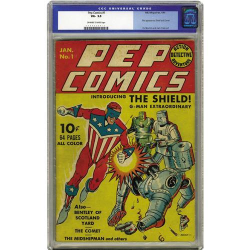 <B>Pep Comics #1 (MLJ, 1940) CGC VG- 3.5 Off-white to white pages.</B></I> The Shield's first appearance in this issue predated the debuts of Captain America and other star-spangled types, making the Shield the first patriotic-themed superhero. Among many other features in the issue are the origin and first appearance of the Comet (by Plastic Man's creator Jack Cole) and the one and only Press Guardian (called the Falcon in this first appearance only), who did his part to protect the freedoms of the Fourth Estate. Irv Novick drew the robot cover as well as the Shield story inside the comic. Overstreet 2006 VG 4.0 value = $1,940. CGC census 3/06: 1 in 3.5, 8 higher.