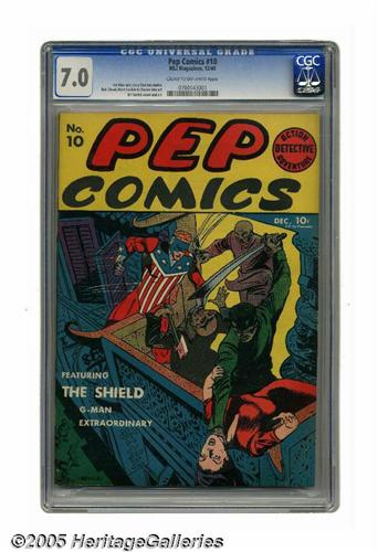 <B>Pep Comics #10 (MLJ, 1940) CGC FN/VF 7.0 Cream to off-white pages.</B></I> This issue stars the Shield, who as we're always quick to note was America's first patriotic-themed comic book hero. He's drawn by Irv Novick both on the cover and inside the book. Also in these pages, top artist Mort Meskin drew an adventure of that defender of the First Amendment, the Press Guardian. Charles Biro's Sergeant Boyle (another patriotic hero) is among the other features. Overstreet 2005 FN 6.0 value = $345; VF 8.0 value = $719. CGC census 3/05: 1 in 7.0, 1 higher.