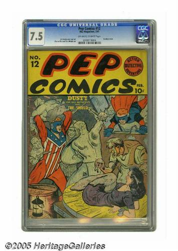 <B>Pep Comics #12 (MLJ, 1941) CGC VF- 7.5 Off-white to white pages.</B></I> America's first flag-themed superhero, the Shield, has his work cut out for him on this bondage cover by Irv Novick -- look at the creepy sculptor and what he's doing to the distressed damsel! At least the Shield's got some help from his sidekick Dusty the Boy Detective. In addition to the Shield story in this issue (also drawn by Novick), there's the work of Charles Biro and Mort Meskin, plus the origin and first appearance of Fireball, who was MLJ's answer to the Human Torch. Overstreet 2005 VF 8.0 value = $863. CGC census 2/05: 1 in 7.5, none higher.