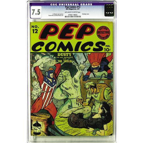 <B>Pep Comics #12 (MLJ, 1941) CGC VF- 7.5 Off-white to white pages.</B></I> America's first flag-themed superhero, the Shield, has his work cut out for him on this bondage cover by Irv Novick -- look at the creepy sculptor and what he's doing to the distressed damsel! At least the Shield's got some help from his sidekick Dusty the Boy Detective. In addition to the Shield story in this issue (also drawn by Novick), there's the work of Charles Biro and Mort Meskin, plus the origin and first appearance of Fireball, who was MLJ's answer to the Human Torch. As of this writing, only four copies of the book have been certified in <I>any</B></I> grade, and our offering leads the pack. Overstreet 2006 VF 8.0 value = $881. CGC census 6/06: 1 in 7.5, none higher. <BR><BR><B>Important notice:</B> Heritage usually auctions material at the rate of 200-250 lots per hour. On some occasions eBay Live bid software or the Internet may not be able to keep up with the pace of the auction. We recommend placing a realistic absentee bid now as insurance to avoid disappointment. Occasionally the auctioneer may eliminate or reject an eBay Live bid, and the auctioneer may also reopen a lot after the close of the eBay live bidding (usually because we missed an audience bid), and may reject your bid even if it shows you as the winning bidder. By bidding via eBay Live, you agree that Heritage may award the lot to another bidder at its sole discretion under the circumstances described above or any other reasonable circumstances. Since eBay bids are not shown to us until we open the lot on the floor, we treat those bids just like floor bids. In most cases the floor responds before the eBay bid is presented to us, due to Internet lag time, so for consistency we have made it a policy that floor bids are always considered first over tie eBay live bids. Also please note that all Heritage lots purchased through eBay Live carry a 22.5% Buyer's Premium. Please make sure you read the Terms and Conditions before you bid. This lot is being auctioned in conjunction with a live floor auction by Heritage Auction Galleries. All final auction and invoice information will be supplied by Heritage Auction Galleries, and all other information should be considered preliminary. Lot:41001 <BR><BR><B>Winning Notification and Billing:</B> After the FINAL session in this auction is complete, Heritage will send e-mail and snail mail invoices. This process normally takes several days. All final auction and invoice information will be supplied by Heritage Auction Galleries, and all other information should be considered preliminary. <BR><BR>This auction will be conducted on a live auction floor and over the Internet through eBay Live. If you choose to place an absentee bid, please take a moment to <font color='#0000ff'><u><a href='http://pages.ebay.com/liveauctions/help/before/laabsentee.html'>learn how eBay Live absentee bidding works</a></u></font><font color='#000000'>