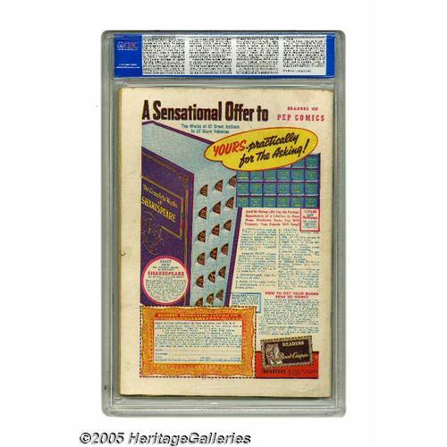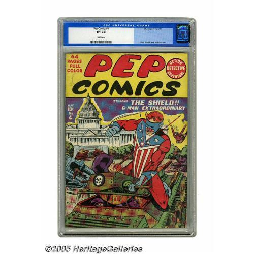 <B>Pep Comics #4 (MLJ, 1940) CGC VF- 7.5 White pages.</B></I> Believe it or not, this issue's Shield story features an attack on Pearl Harbor, more than a year before the real-life tragedy! The attackers here are not the Japanese but the ""Mosconians"" (who all speak with German accents). And it may surprise some to know that comic book crossovers happened even in the Golden Age: the battle with the Mosconians was also being fought by the Wizard in the pages of " "<B>Top-Notch Comics</B></I>; the Wizard even appears in a few panels of this story to compare notes with the Shield! The Fu Chang backup feature is notable for having an early robot story. Also worth mentioning are artists Irv Novick (who drew the cover), Charles Biro, Jack Cole, and Mort Meskin. Overstreet 2005 VF 8.0 value = $938. CGC census 9/05: 1 in 7.5, none higher. <BR><BR><B>Important notice:</B> Heritage usually auctions material at the rate of 200-250 lots per hour. On some occasions eBay Live bid software or the Internet may not be able to keep up with the pace of the auction. We recommend placing a realistic absentee bid now as insurance to avoid disappointment. Occasionally the auctioneer may eliminate or reject an eBay Live bid, and the auctioneer may also reopen a lot after the close of the eBay live bidding (usually because we missed an audience bid), and may reject your bid even if it shows you as the winning bidder. By bidding via eBay Live, you agree that Heritage may award the lot to another bidder at its sole discretion under the circumstances described above or any other reasonable circumstances. Since eBay bids are not shown to us until we open the lot on the floor, we treat those bids just like floor bids. In most cases the floor responds before the eBay bid is presented to us, due to Internet lag time, so for consistency we have made it a policy that floor bids are always considered first over tie eBay live bids. Also please note that all Heritage lots purchased through eBay Live