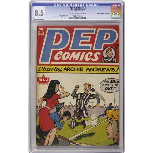 <B>Pep Comics #53 Davis Crippen ("D" Copy) pedigree (MLJ, 1945) CGC VF+ 8.5 Off-white to white pages.</B></I> Bill Vigoda is credited with this issue's baseball cover featuring Archie. Inside the book, Irv Novick handled the patriotic exploits of the Shield. Overstreet 2006 VF 8.0 value = $158; VF/NM 9.0 value = $234. CGC census 9/06: 1 in 8.5, none higher. <I>From the Crippen Collection.</B></I><BR><BR><b>Shipping:</b> Slabbed Comic (<a target="_blank" href="http://www.heritageauctions.com/common/shipping.php">view shipping information</a>)