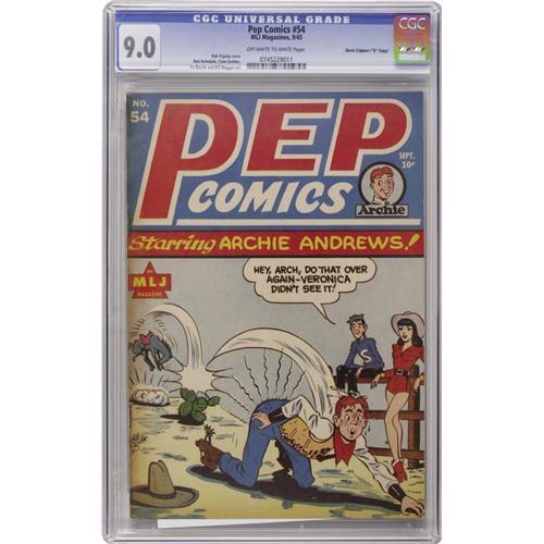 <B>Pep Comics #54 Davis Crippen ("D" Copy) pedigree (MLJ, 1945) CGC VF/NM 9.0 Off-white to white pages.</B></I> Archie's the star of the show, but the Shield and the Black Hood added superheroics to the issue. The cover's by Bill Vigoda. Overstreet 2006 VF/NM 9.0 value = $234; NM- 9.2 value = $310. CGC census 9/06: 1 in 9.0, 1 higher. <I>From the Crippen Collection</B></I>.<BR><BR><b>Shipping:</b> Slabbed Comic (<a target="_blank" href="http://www.heritageauctions.com/common/shipping.php">view shipping information</a>)