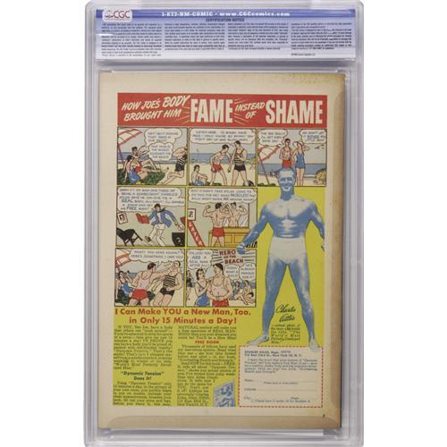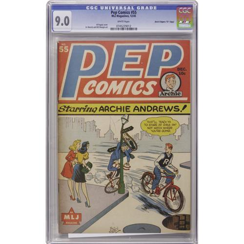 <B>Pep Comics #55 Davis Crippen ("D" Copy) pedigree (MLJ, 1945) CGC VF/NM 9.0 White pages.</B></I> What caught our eye here (besides a nice copy of a WWII Archie!) is a character acting very much <I>out</B></I> of character -- since when does Jughead give a hoot about girls? Al Fagaly drew the cover. Inside, there's mostly funny stuff, with the Shield adding some costumed crusading. Overstreet 2006 VF/NM 9.0 value = $234; NM- 9.2 value = $310. CGC census 9/06: 2 in 9.0, none higher. <I>From the Crippen Collection</B></I>.<BR><BR><b>Shipping:</b> Slabbed Comic (<a target="_blank" href="http://www.heritageauctions.com/common/shipping.php">view shipping information</a>)