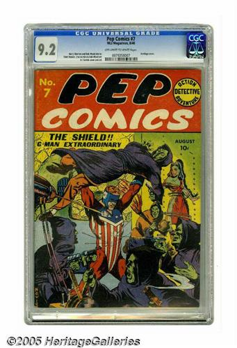 <B>Pep Comics #7 (MLJ, 1940) CGC NM- 9.2 Off-white to white pages.</B></I> This looks to be the best copy available of this issue; it's the only one graded above VF by CGC as of this writing. The bondage cover by Irv Novick features Joe Higgins, G-Man Extraordinary, aka the Shield. Interior artists include Novick, Mort Meskin, and Charles Biro. Overstreet 2005 NM- 9.2 value = $1,500. CGC census 5/05: 1 in 9.2, none higher.