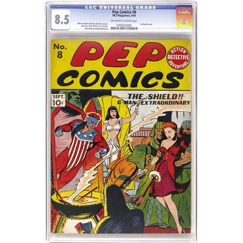 <B>Pep Comics #8 (MLJ, 1940) CGC VF+ 8.5 Off-white to white pages.</B></I> This issue starred the Shield, who was really FBI agent Joe Higgins, and the four stars on his costume stood for Truth, Courage, Patriotism, and Justice! The book's other main hero, the Comet, believed in justice too, but preferred the vigilante variety. Also on hand was Sergeant Boyle, a youngster who fought World War II the only way an American could in 1940: by joining the British army! Charles Biro drew that feature; other notable artists include Jack Cole (drawing the Comet for the last time) and Mort Meskin. The cover is by Irv Novick. Overstreet 2006 VF 8.0 value = $744; VF/NM 9.0 value = $1,172. CGC census 6/06: 2 in 8.5, none higher. <BR><BR><B>Important notice:</B> Heritage usually auctions material at the rate of 200-250 lots per hour. On some occasions eBay Live bid software or the Internet may not be able to keep up with the pace of the auction. We recommend placing a realistic absentee bid now as insurance to avoid disappointment. Occasionally the auctioneer may eliminate or reject an eBay Live bid, and the auctioneer may also reopen a lot after the close of the eBay live bidding (usually because we missed an audience bid), and may reject your bid even if it shows you as the winning bidder. By bidding via eBay Live, you agree that Heritage may award the lot to another bidder at its sole discretion under the circumstances described above or any other reasonable circumstances. Since eBay bids are not shown to us until we open the lot on the floor, we treat those bids just like floor bids. In most cases the floor responds before the eBay bid is presented to us, due to Internet lag time, so for consistency we have made it a policy that floor bids are always considered first over tie eBay live bids. Also please note that all Heritage lots purchased through eBay Live carry a 22.5% Buyer's Premium. Please make sure you read the Terms and Conditions before you bid. This lot is being auctioned in conjunction with a live floor auction by Heritage Auction Galleries. All final auction and invoice information will be supplied by Heritage Auction Galleries, and all other information should be considered preliminary. Lot:41001 <BR><BR><B>Winning Notification and Billing:</B> After the FINAL session in this auction is complete, Heritage will send e-mail and snail mail invoices. This process normally takes several days. All final auction and invoice information will be supplied by Heritage Auction Galleries, and all other information should be considered preliminary. <BR><BR>This auction will be conducted on a live auction floor and over the Internet through eBay Live. If you choose to place an absentee bid, please take a moment to <font color='#0000ff'><u><a href='http://pages.ebay.com/liveauctions/help/before/laabsentee.html'>learn how eBay Live absentee bidding works</a></u></font><font color='#000000'>