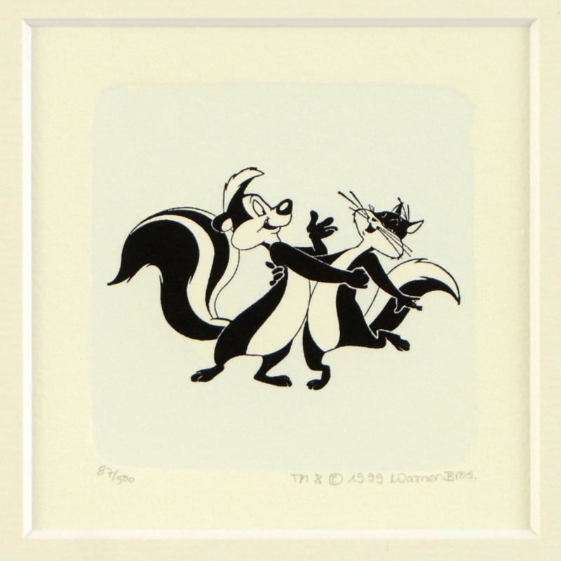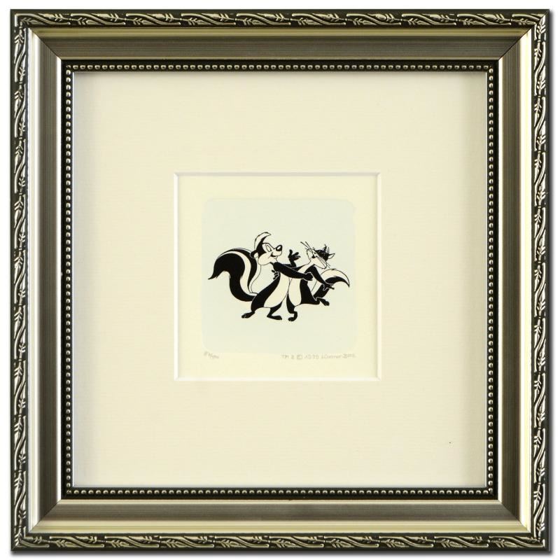 "Pepe Le Pew Dancing (Large)" is a limited edition etching on paper with hand-tinted coloring from Warner Bros. (dated 1999) and numbered! This piece comes framed. Measures approx. 9" x 9" (with frame), 2.5" x 2" (image).