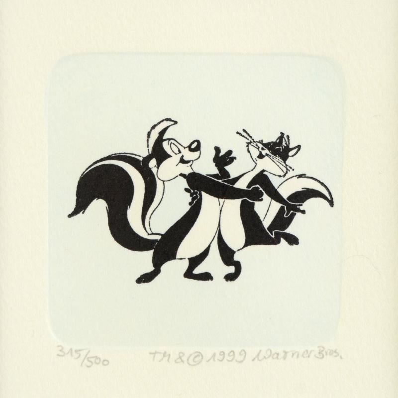 "Pepe Le Pew Dancing (Small)" is a limited edition etching on paper with hand-tinted coloring from Warner Bros. (dated 1999) and numbered! This piece comes framed. Measures approx. 9" x 9" (with frame), 1.5" x 1" (image).