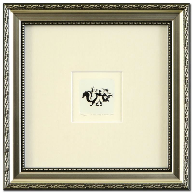 "Pepe Le Pew Dancing (Small)" is a limited edition etching on paper with hand-tinted coloring from Warner Bros. (dated 1999) and numbered! This piece comes framed. Measures approx. 9" x 9" (with frame), 1.5" x 1" (image).