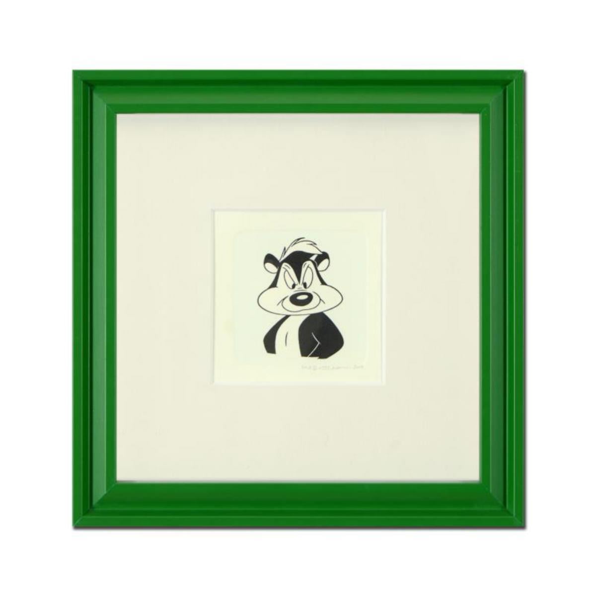 "Pepe Le Pew" is a limited edition etching on paper with hand-tinted coloring from Warner Bros, numbered and dated 1999. This piece comes framed. Measures approx. 9" x 9" (with frame), 2" x 2.5" (image). Reference #: 235689.