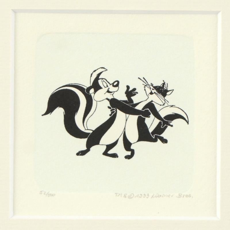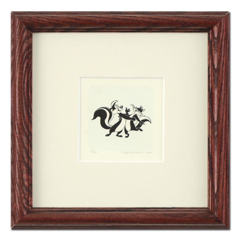 "Pepe Le Pew & Penelope Pussycat" is a limited edition etching on paper with hand-tinted coloring from Warner Bros, numbered and dated 1999. This piece comes framed. Measures approx. 8.5" x 8.5" (with frame), 2.5" x 2" (image).
