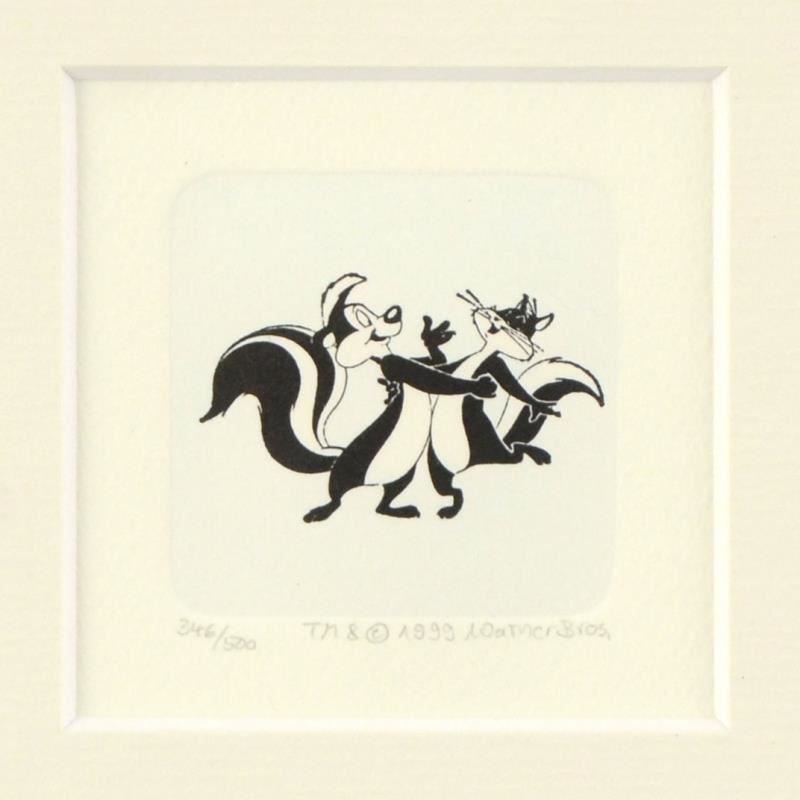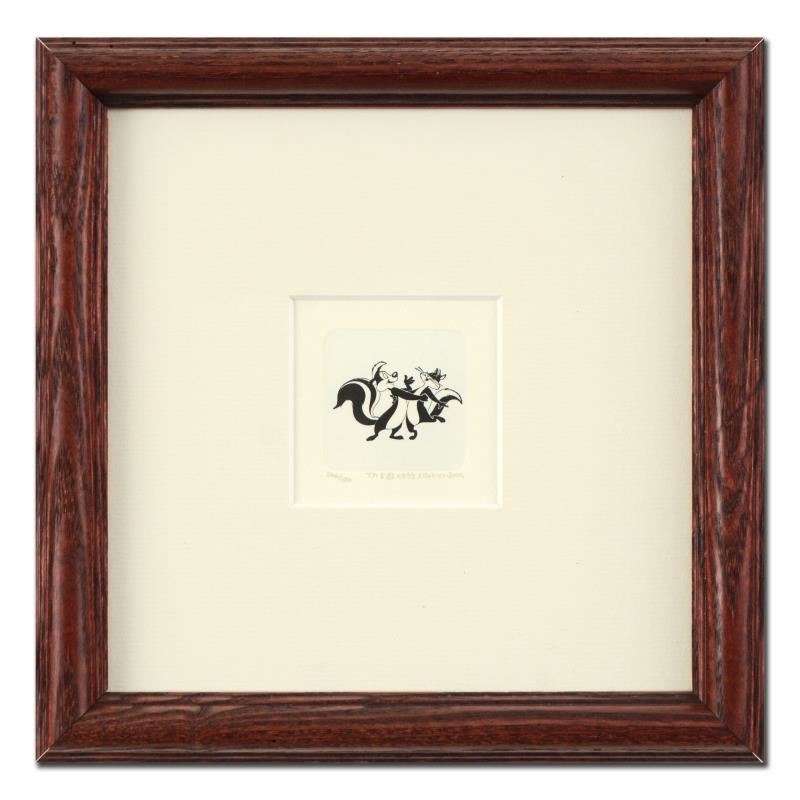 "Pepe Le Pew & Penelope Pussycat" is a limited edition etching on paper with hand-tinted coloring from Warner Bros, numbered and dated 1999. This piece comes framed. Measures approx. 8.5" x 8.5" (with frame), 1.5" x 1" (image).