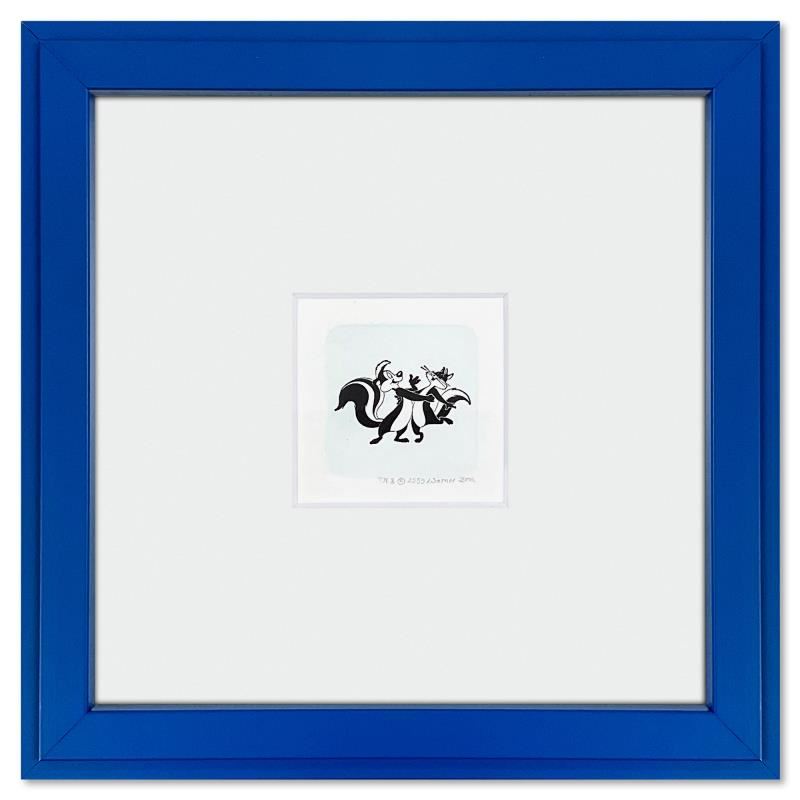 "Pepe Le Pew & Penelope Pussycat" is a limited edition etching on paper with hand tinted coloring from Warner Bros., numbered and dated 1999. This piece comes framed. Measures approx. 9" x 9" (frame), 1" x 1.5" (image).