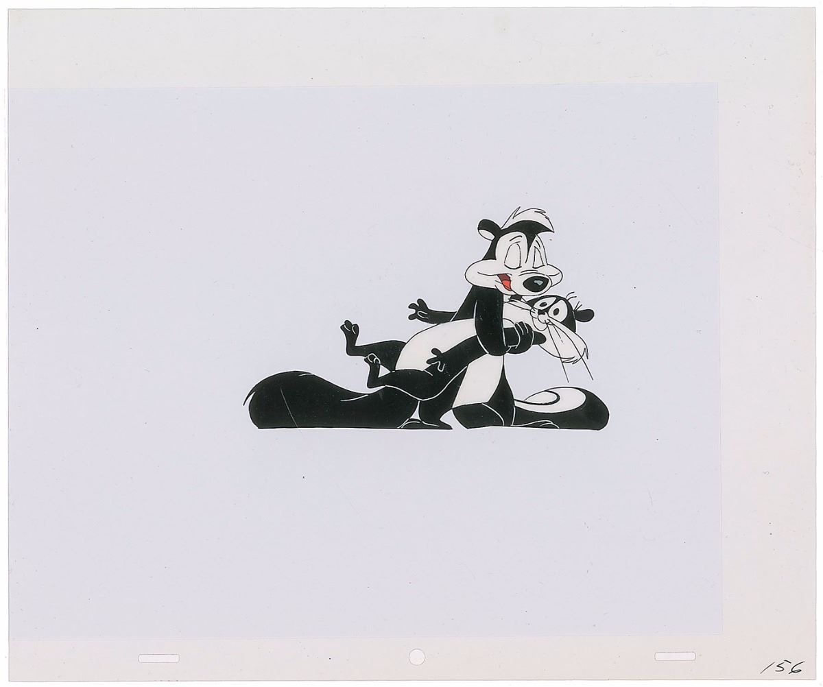 (Warner Brothers Studios, circa 1950s) Original production cel featuring Pepe Le Pew and Penelope Pussycat, showing the amorous skunk clutching his bewildered love interest. Image measures 5.5 x 3.5, with overall dimensions of 12.5 x 10.5. In fine condition.
