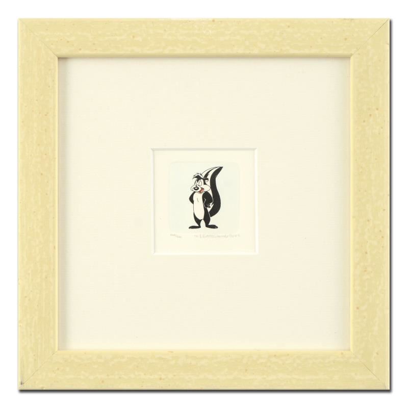 "Pepe Le Pew" is a limited edition etching on paper with hand-tinted coloring from Warner Bros, numbered and dated 1999. This piece comes framed. Measures approx. 9" x 9" (with frame), 1" x 1.5" (image).