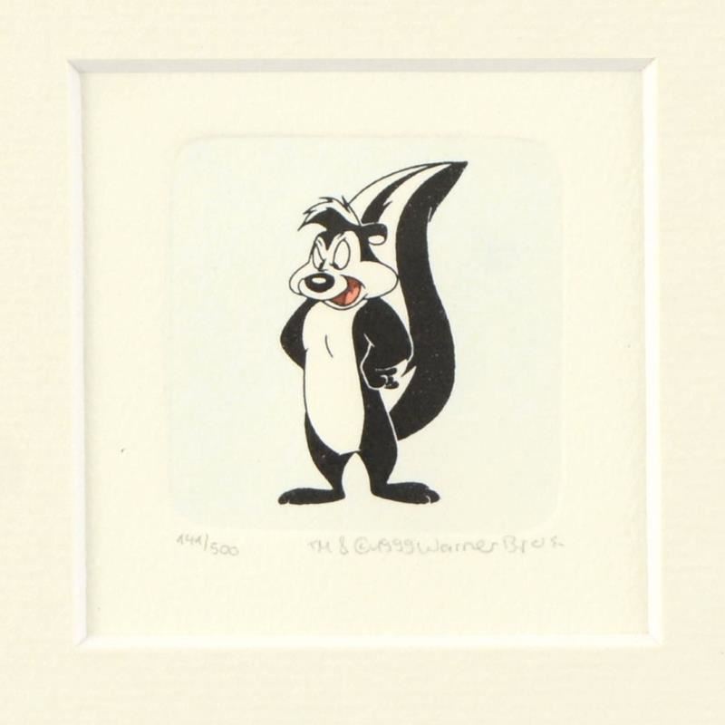 "Pepe Le Pew" is a limited edition etching on paper with hand-tinted coloring from Warner Bros, numbered and dated 1999. This piece comes framed. Measures approx. 9" x 9" (with frame), 1" x 1.5" (image). Please allow 5 additional business for items that include canvas stretch or framing.