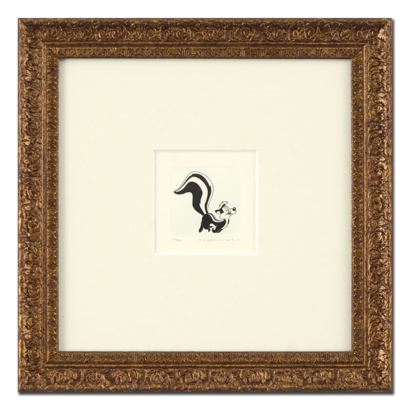 "Pepe Le Pew" is a limited edition etching on paper with hand-tinted coloring from Warner Bros, numbered and dated 1999. This piece comes framed. Measures approx. 9" x 9" (with frame), 1.5" x 1.5" (image).