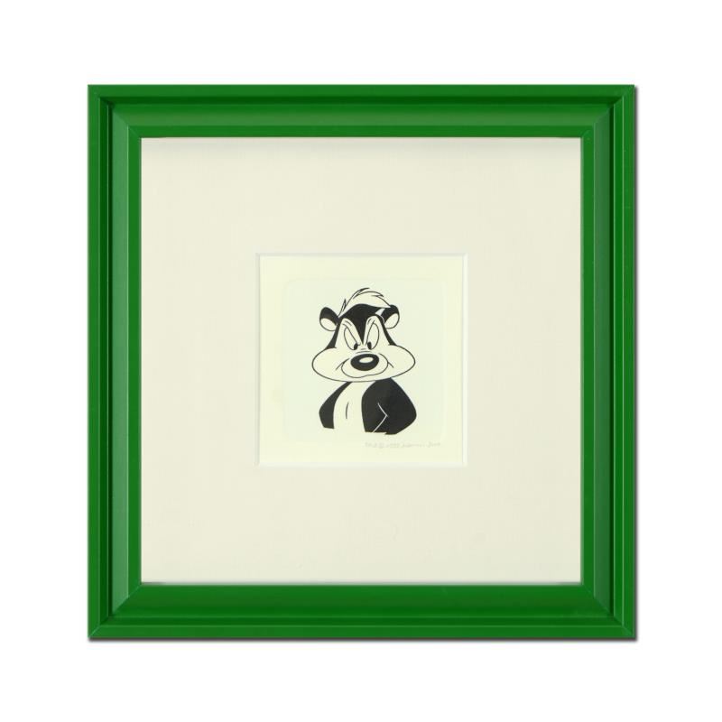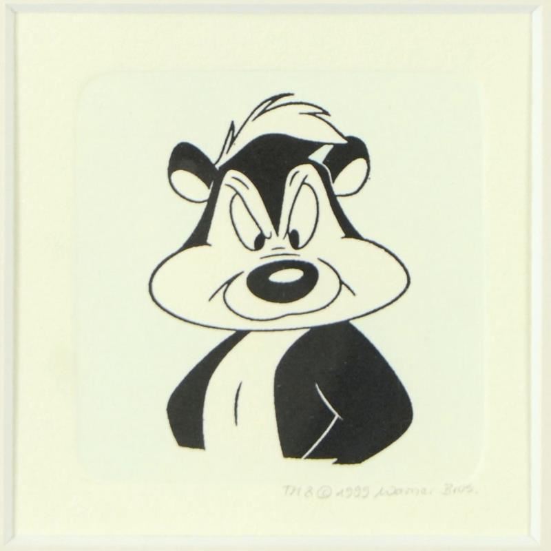 "Pepe Le Pew" is a limited edition etching on paper with hand-tinted coloring from Warner Bros, numbered and dated 1999. This piece comes framed. Measures approx. 9" x 9" (with frame), 2" x 2.5" (image).