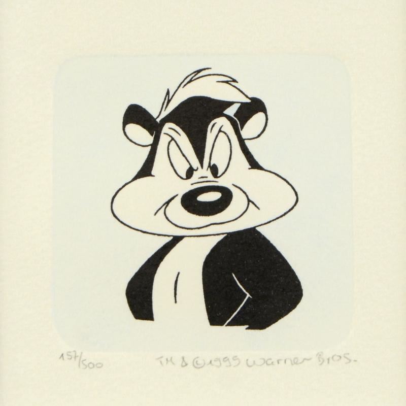 "Pepe Le Pew" is a limited edition etching on paper with hand-tinted coloring from Warner Bros. (dated 1999) and numbered! This piece is framed. Measures approx. 8.5" x 8.5" (with frame), 1.5" x 1.5" (each image).