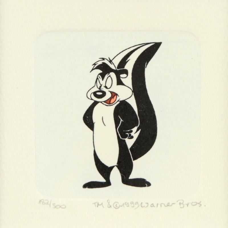 "Pepe Le Pew" is a limited edition etching on paper with hand-tinted coloring from Warner Bros. (dated 1999) and numbered! This piece is framed. Measures approx. 8.5" x 8.5" (with frame), 1" x 2" (each image).