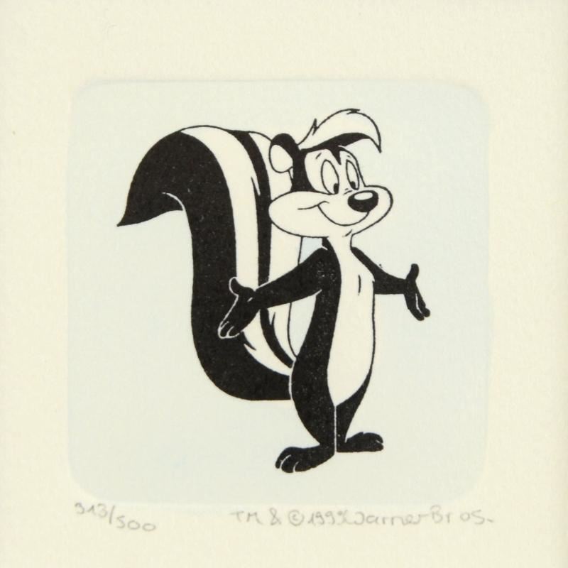 "Pepe Le Pew" is a limited edition etching on paper with hand-tinted coloring from Warner Bros. (dated 1999) and numbered! This piece is framed and is ready to hang. Measures approx. 8.5" x 8.5" (with frame), 1.5" x 1.5" (each image).