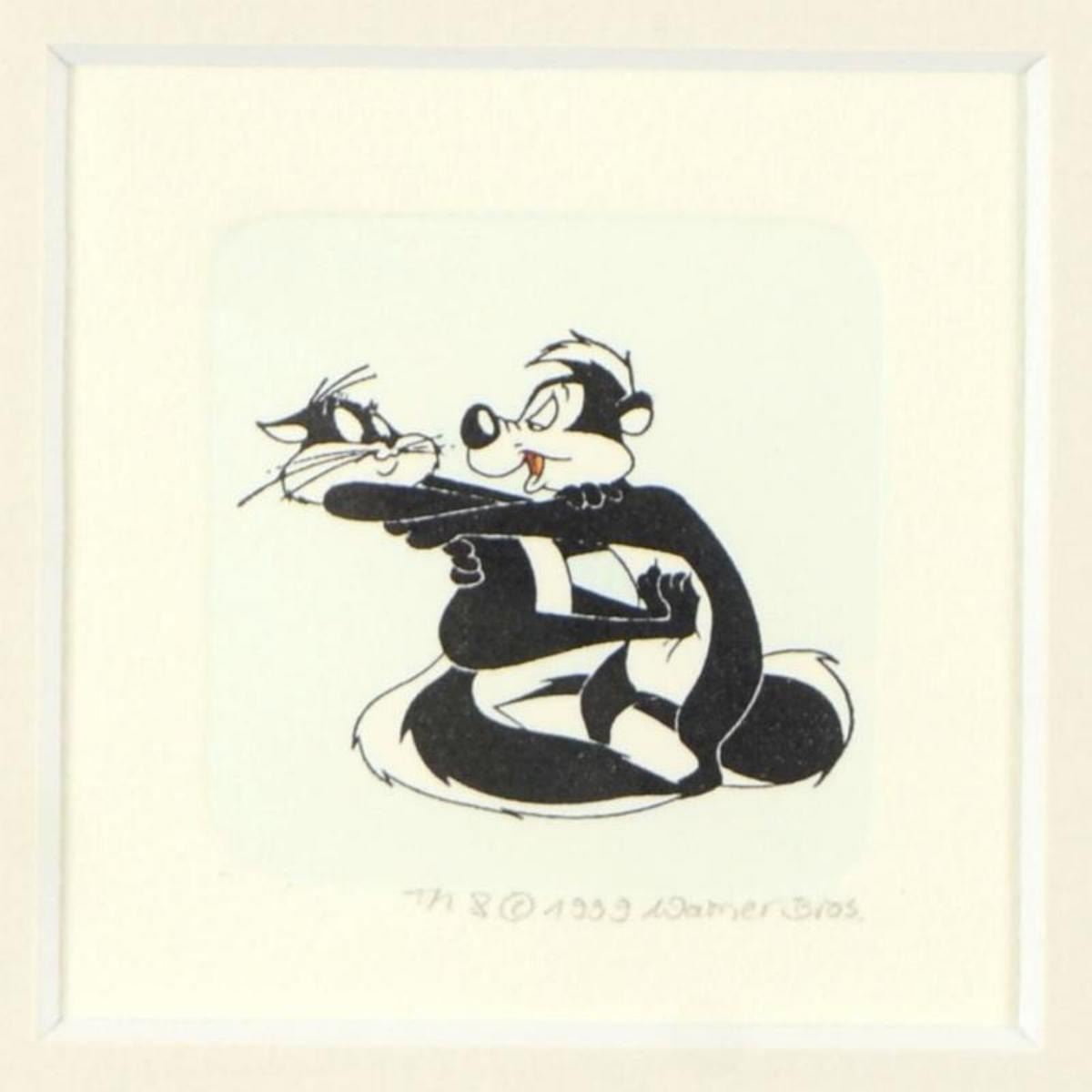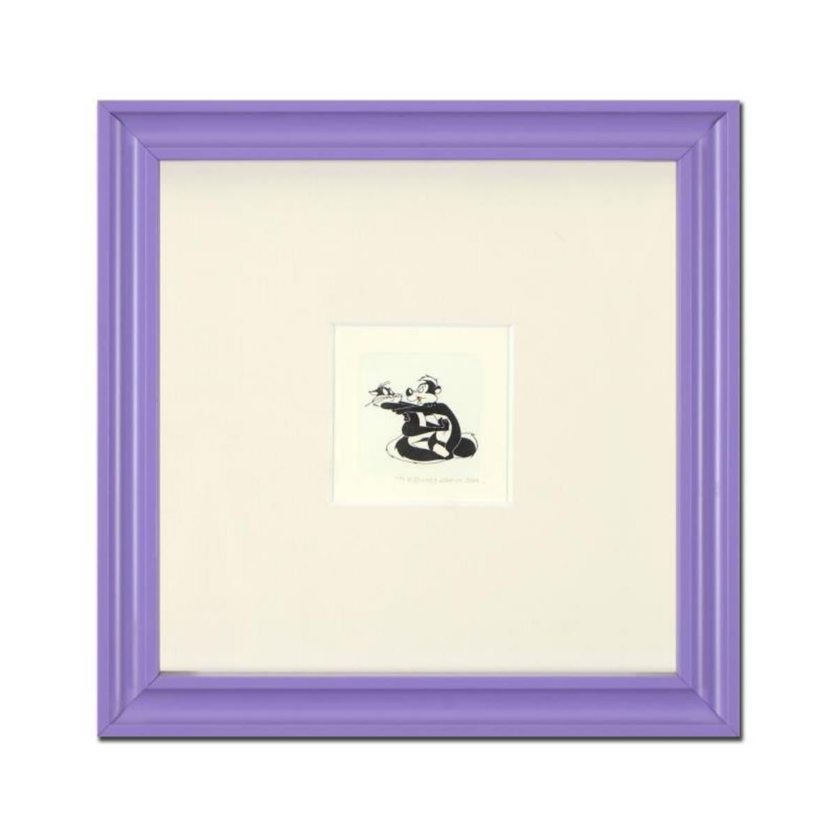 "Pepe Le Pew in Love" is a limited edition etching on paper with hand-tinted coloring from Warner Bros, numbered and dated 1999. This piece comes framed. Measures approx. 9" x 9" (with frame), 2" x 2.5" (image). Reference #: 235691.
