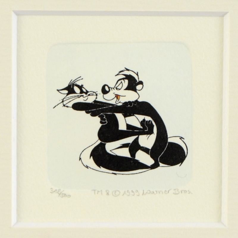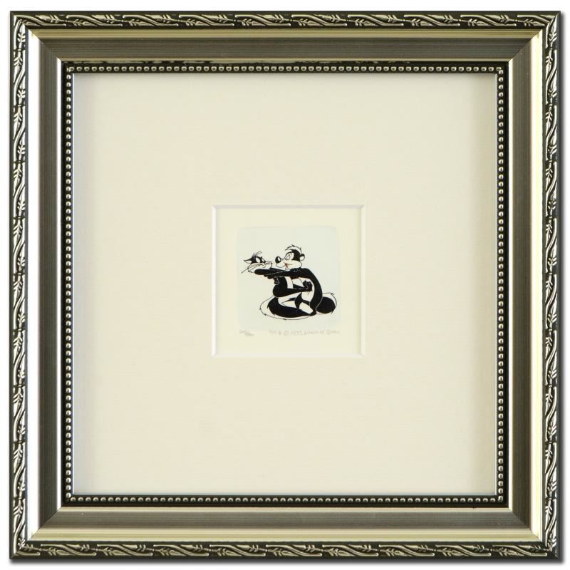 "Pepe Le Pew in Love (Small)" is a limited edition etching on paper with hand-tinted coloring from Warner Bros. (dated 1999) and numbered! This piece comes framed. Measures approx. 9" x 9" (with frame), 1.5" x 1" (image).