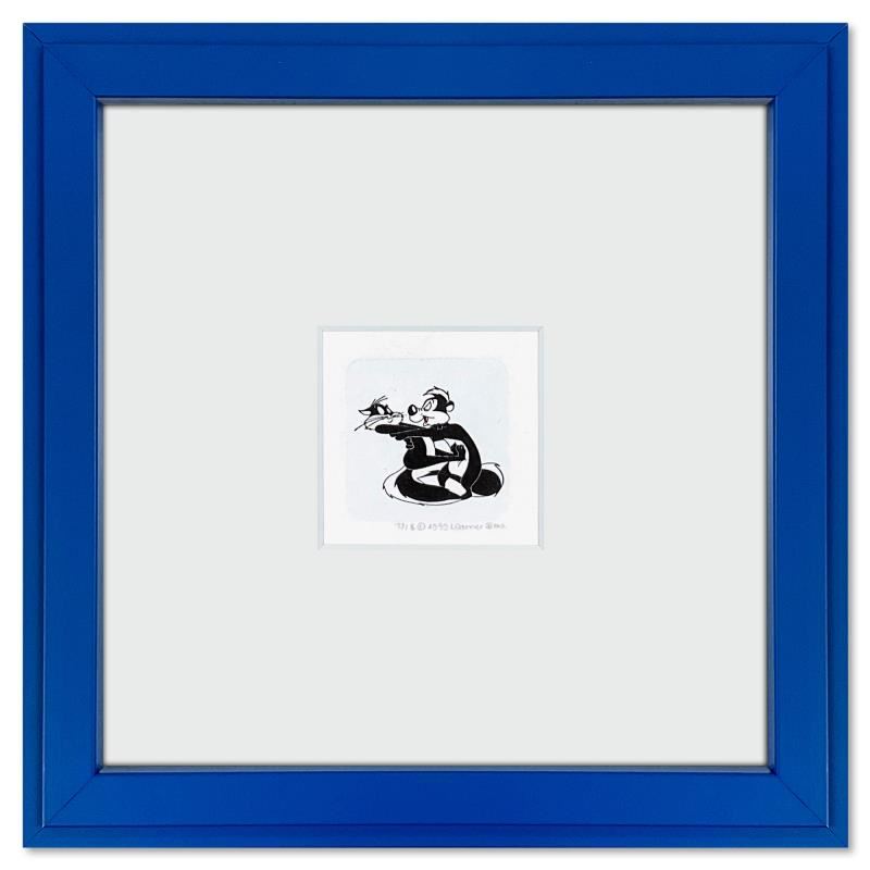 "Pepe Le Pew in Love" is a limited edition etching on paper with hand tinted coloring from Warner Bros. numbered and dated 1999. This piece comes framed. Measures approx. 9" x 9" (frame) 2" x 1.5" (image).