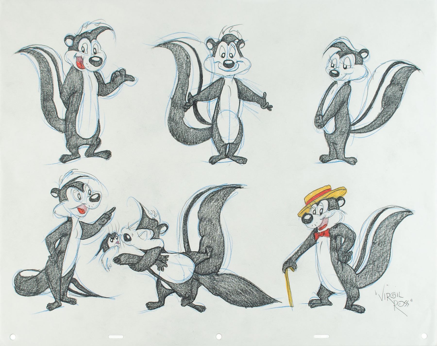 (Warner Brothers Studios, circa 1990s) Large original color model drawing by Virgil Ross featuring Pepé Le Pew, showing the romantically inclined skunk in six different full-figure poses. Accomplished in graphite and colored pencil on untrimmed 17 x 13.5 animation paper, signed at the bottom in pencil, "Virgil Ross." In fine condition. This one-of-a-kind drawing was done to be sold in the Warner Brothers Studio stores in the 1990s.