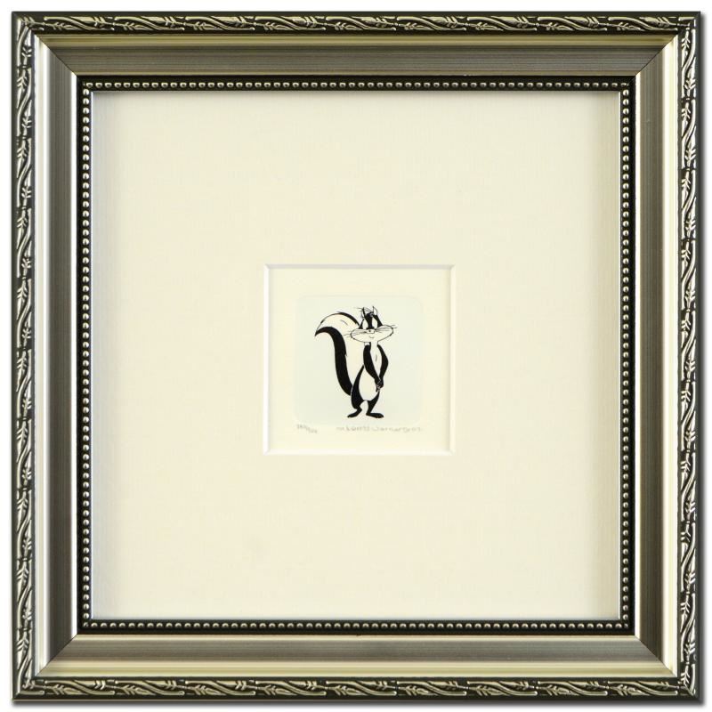 "Pepe Le Pew's Girlfriend" is a limited edition etching on paper with hand-tinted coloring from Warner Bros. (dated 1999) and numbered! This piece comes framed. Measures approx. 9" x 9" (with frame), 2" x 2" (image).