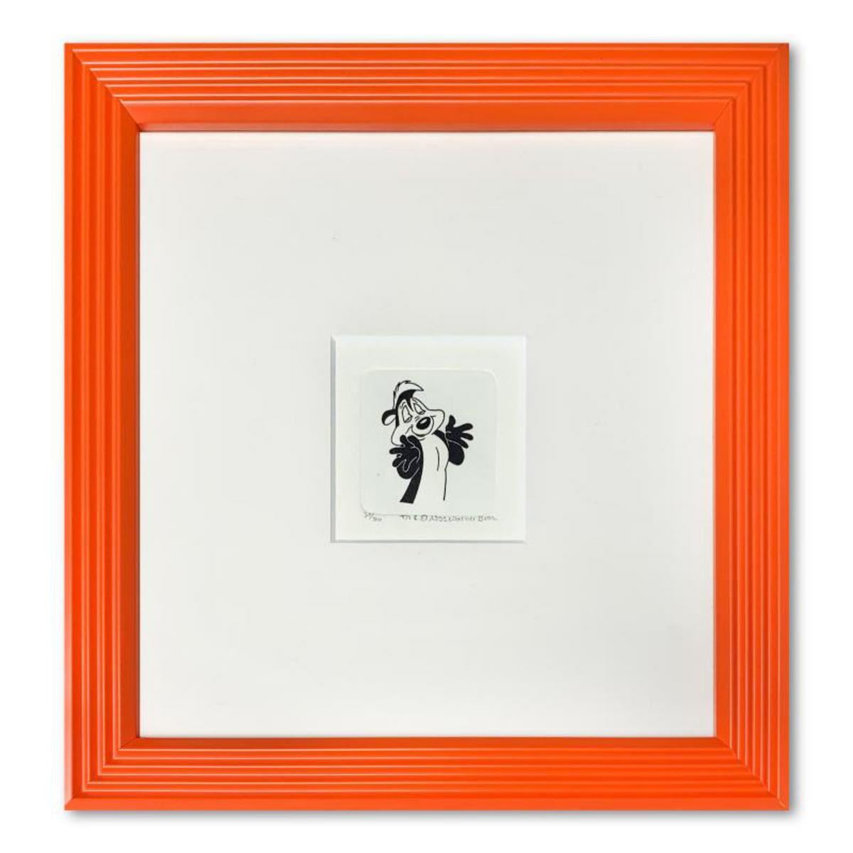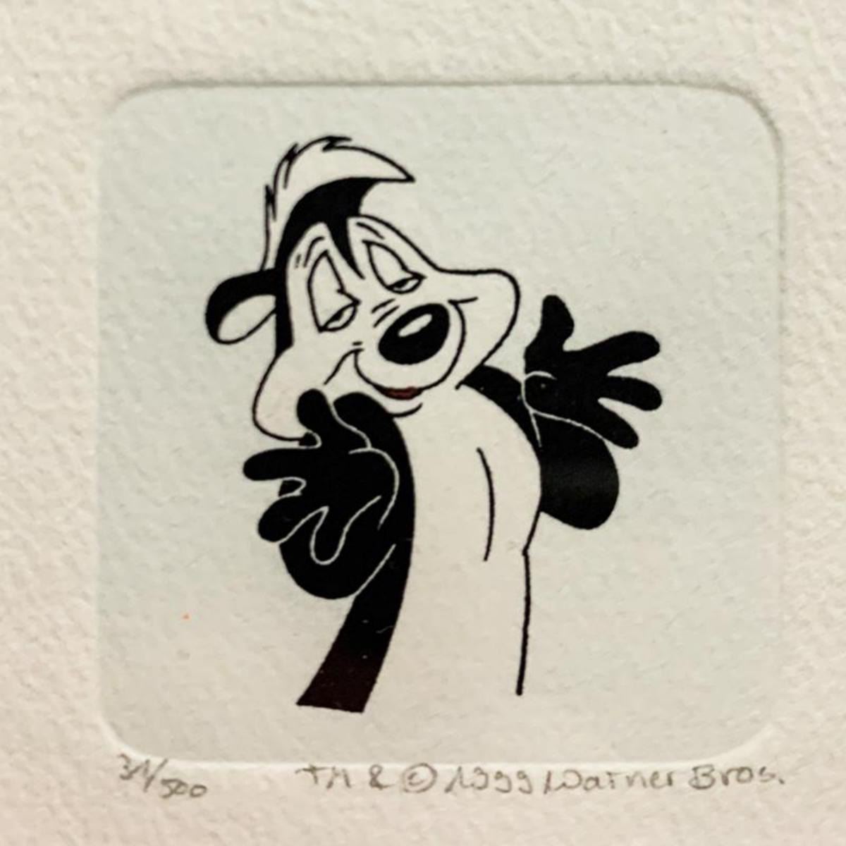 "Pepe le Pew" is a limited edition etching on paper with hand-tinted coloring from Warner Bros, numbered and dated 1999. This piece comes framed. Measures approximately 9" x 9" (with frame), 2" x 2" (image). Reference #: 245195.