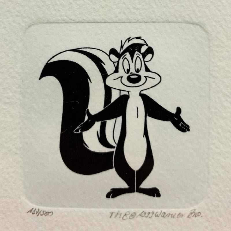 "Pepe le Pew" is a limited edition etching on paper with hand-tinted coloring from Warner Bros, numbered and dated 1999. This piece comes framed. Measures approximately 9" x 9" (with frame), 2" x 2" (image).