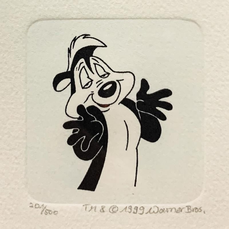 "Pepe le Pew" is a limited edition etching on paper with hand-tinted coloring from Warner Bros, numbered and dated 1999. This piece comes framed. Measures approximately 9" x 9" (frame), 2" x 2" (image).