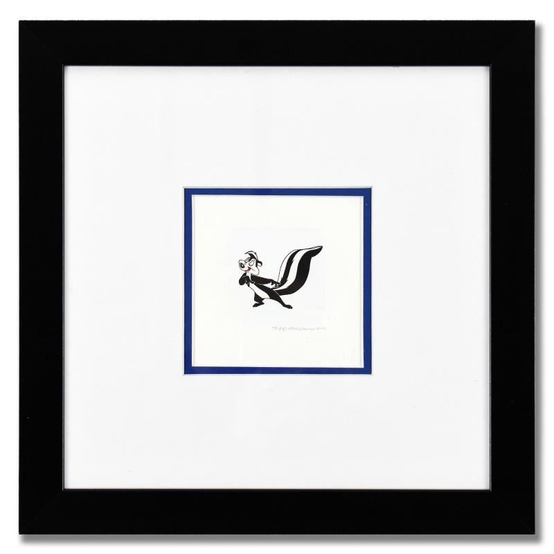 "Pepe le Pew" is a limited edition etching on paper with hand-tinted coloring from Warner Bros, numbered and dated 1999. This piece comes framed. Measures approximately 14" x 14" (frame), 2.5" x 2.5" (image).
