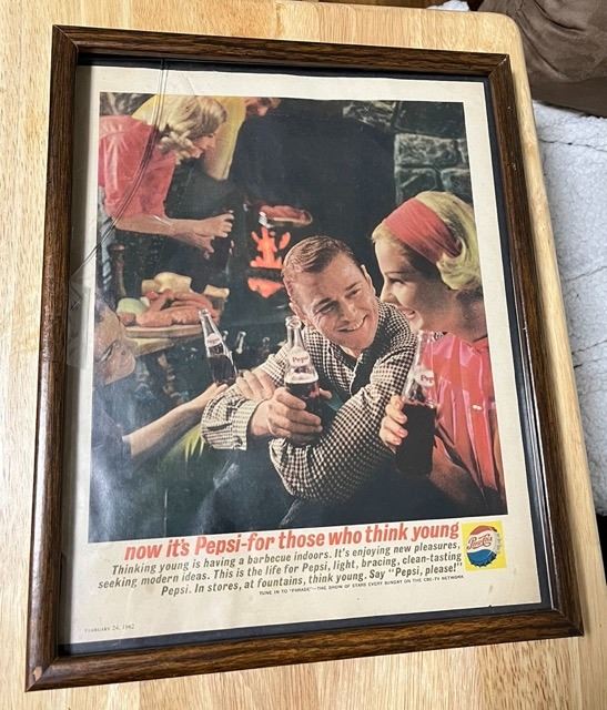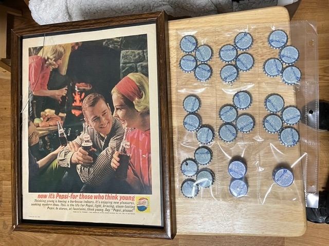 Pepsi Advertising In Picture Frame & Diet Pepsi Bottle Caps