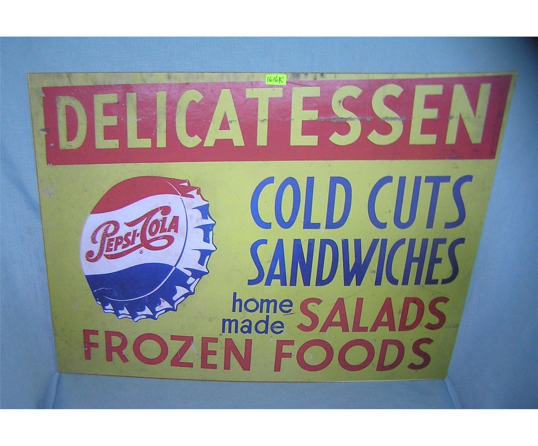 Pepsi Cola Delicatessen cold cuts, sandwhiches, home salads and frozen foods retro style advertising sign 18 inches by 24 inches mounted on Masonite est. value $200.00-$215.00