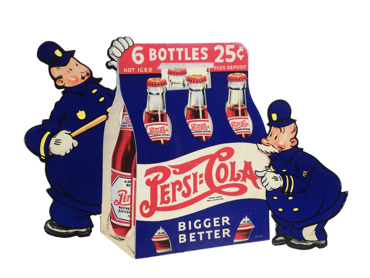 Pepsi Cola Double Dot Die Cut Cardboard Sign. Six pack, 1940 ?. Dog eared upper right corner otherwise excellent condition. 21 X 14 1/2 inches.